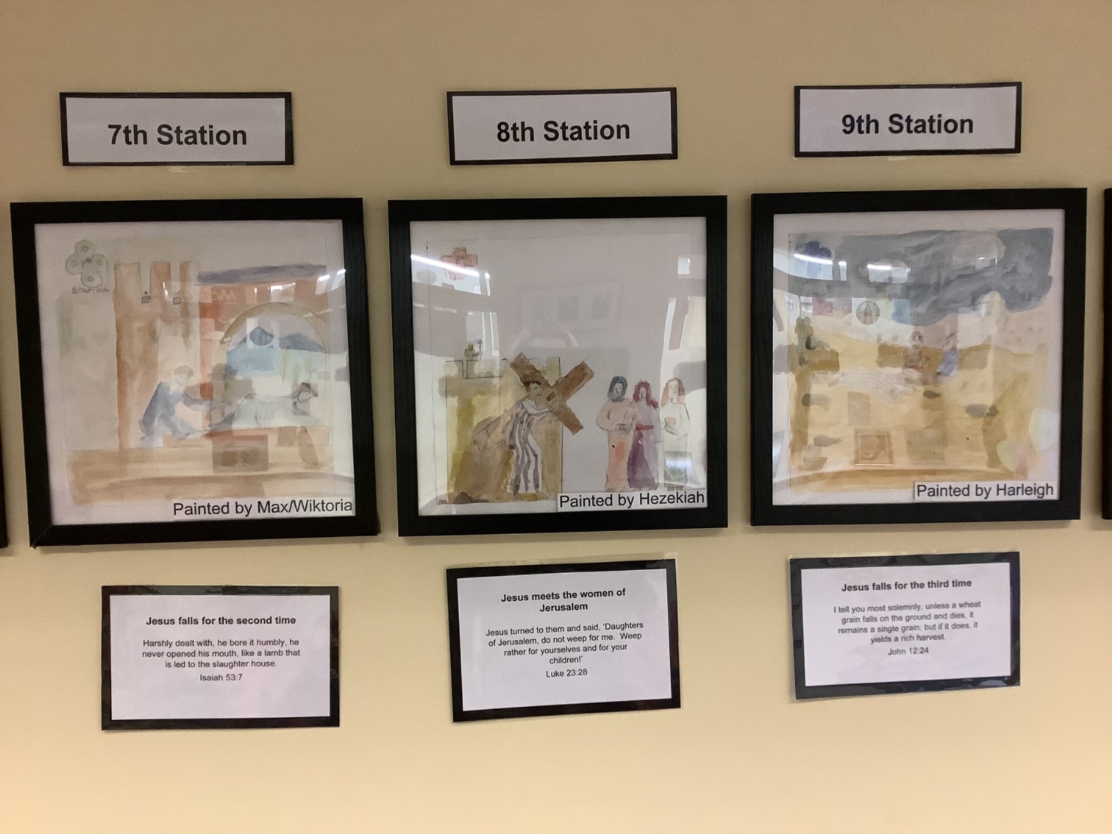 The Stations of the Cross are displayed in the school chapel and were drawn and painted by our Year 6 pupils. We pray the Stations of the Cross at a variety of times in the year; during Lent the Faith Council lead parents, parishioners, governors and trustees through a special prayer service where they pray the Stations of the Cross together.
