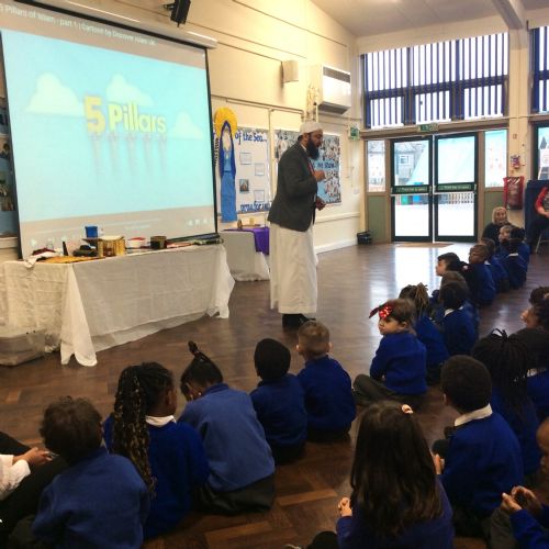 Through interactive assemblies, the children learnt about the 5 Pillars of Islam in bespoke age-appropriate ways. Imran showed artefacts linked to the 5 Pillars and the children had the opportunity to try on a hijab, kneel on a prayer mat, taste dates, attempt to read from the Qur’an and to learn about charity and fasting. Imran also sang the Al-Fatiha, which is the opening of the Qur’an, to the children, which further heightened their awareness and appreciation of his faith.